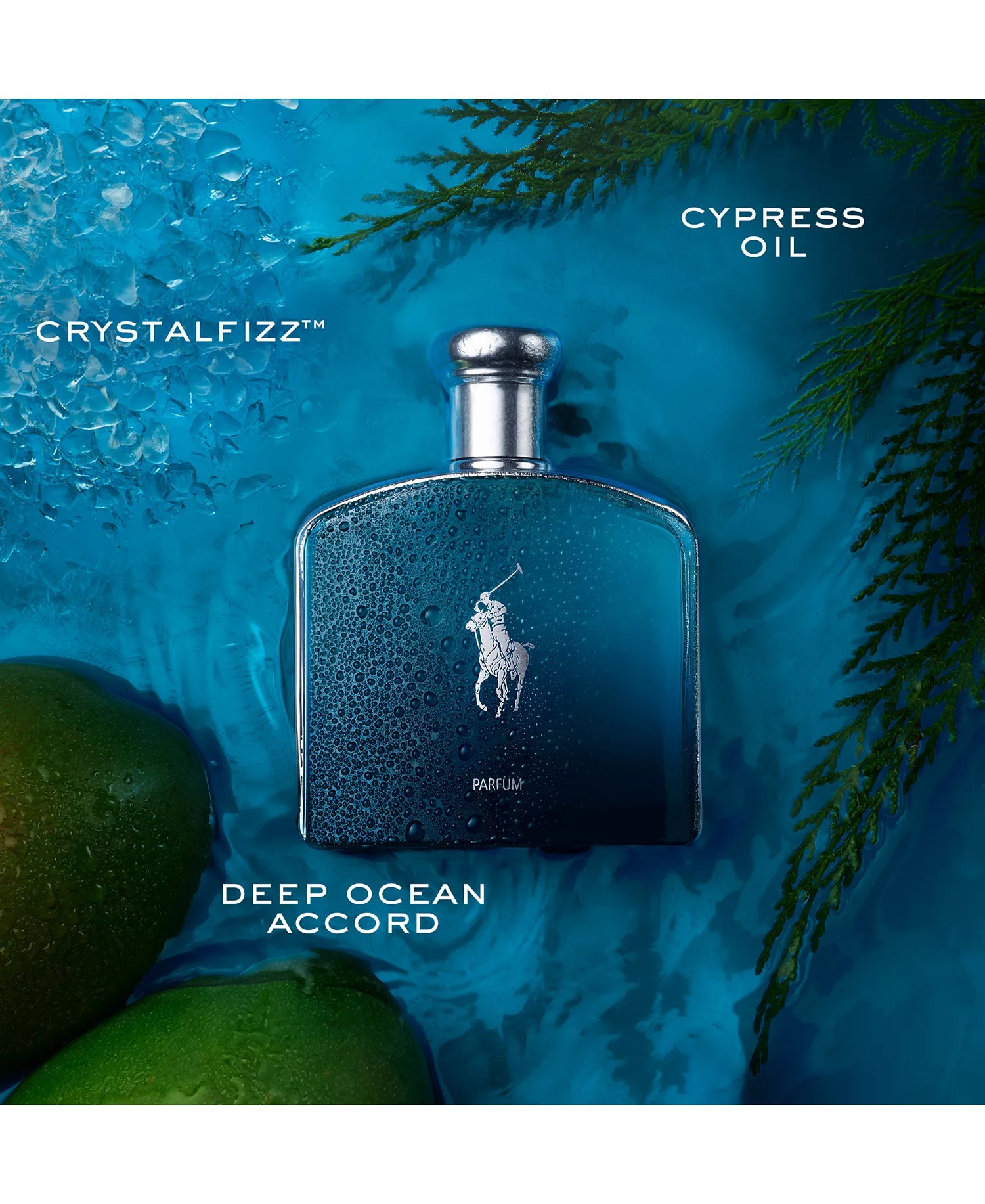 A powerful wave of fresh thanks to CristalFizz, an exclusive aquatic ingredient, only found in Ralph Lauren's Deep Blue Parfum, that boosts the intensity and freshness of the fragrance. FragranceULove.
